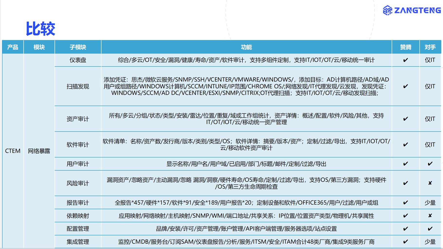 网络暴露包括IT资产管理、OT资产管理、漏洞管理、硬件生命周期管理、软件生命周期管理、合规管理、依赖映射管理等模块。