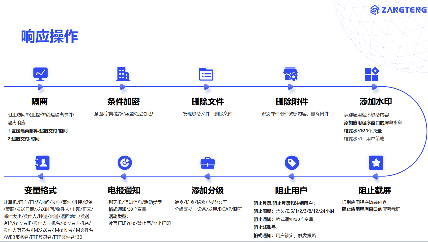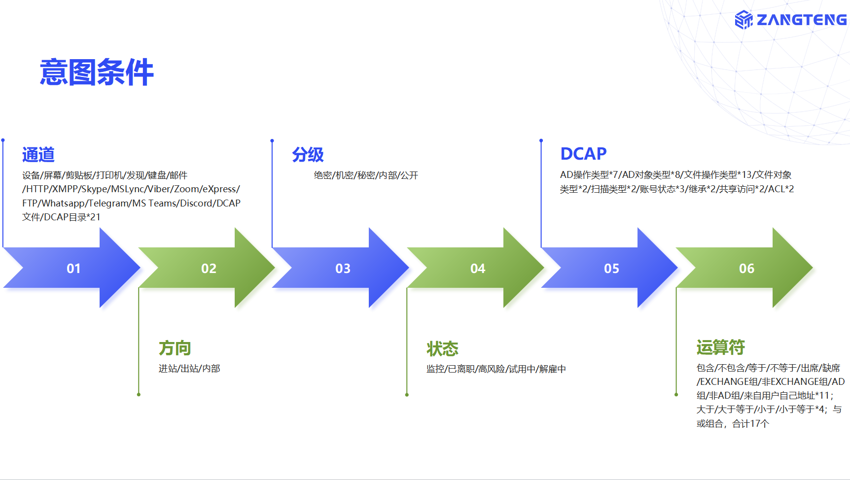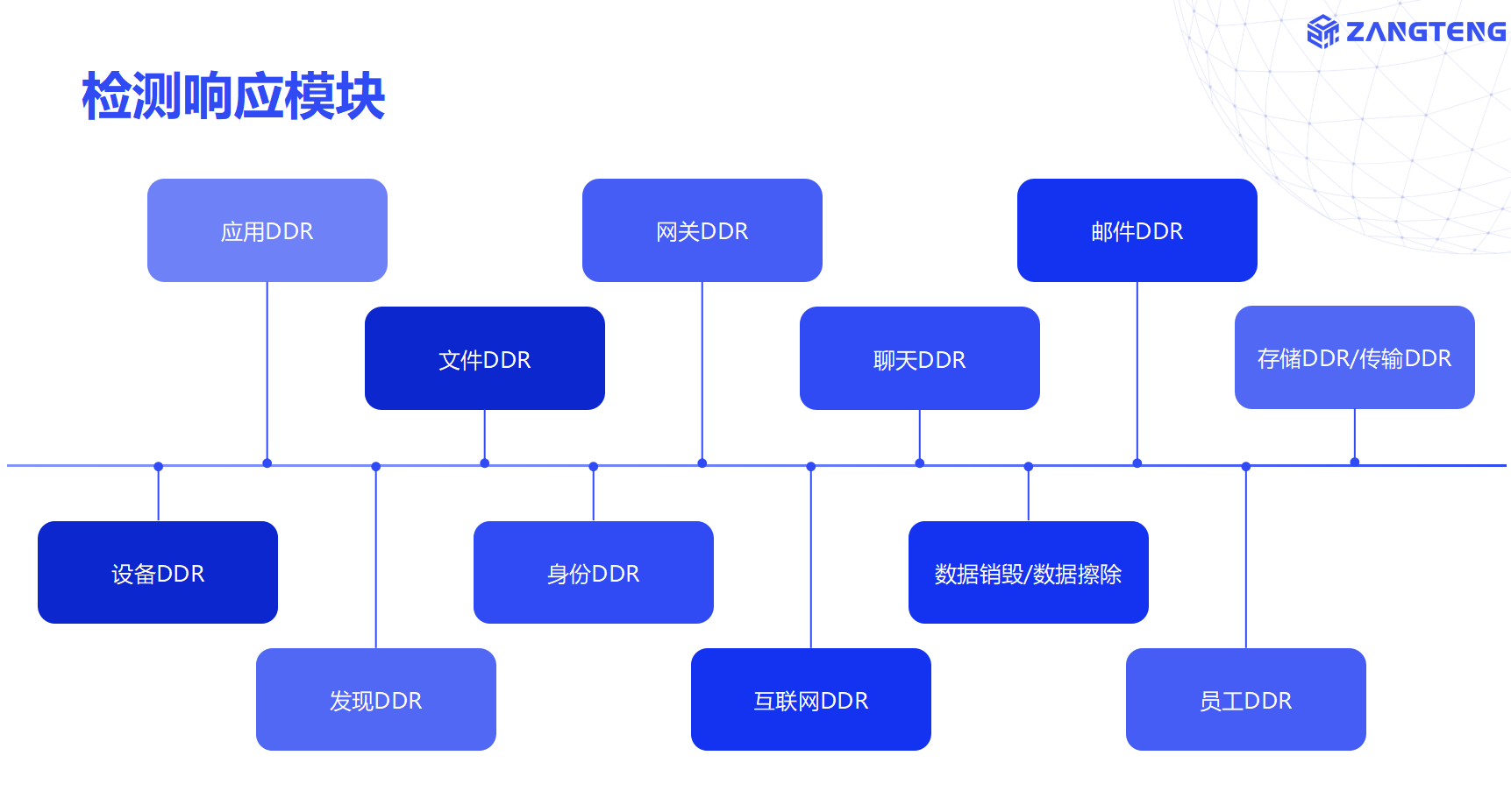 数据检测响应包括设备DDR、互联网DDR、邮件DDR、聊天DDR、应用DDR、屏拍DDR、发现DDR、身份DDR、文件DDR、员工DDR、存储DDR等前沿技术。