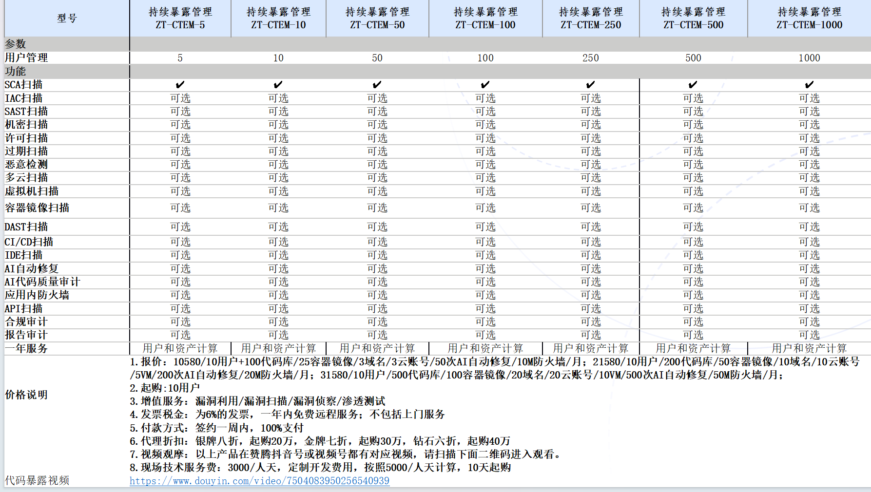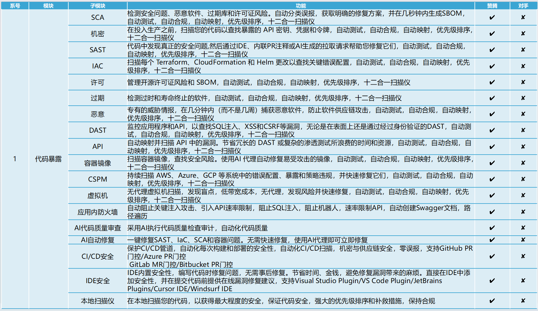 代码包括包括SCA、SBOM、SAST、IAC、DAST、恶意扫描、EOL扫描、CSPM、云资产、容器镜像扫描、虚拟机扫描、AI自动修复、代码自动质量、AI自动分类等功能。