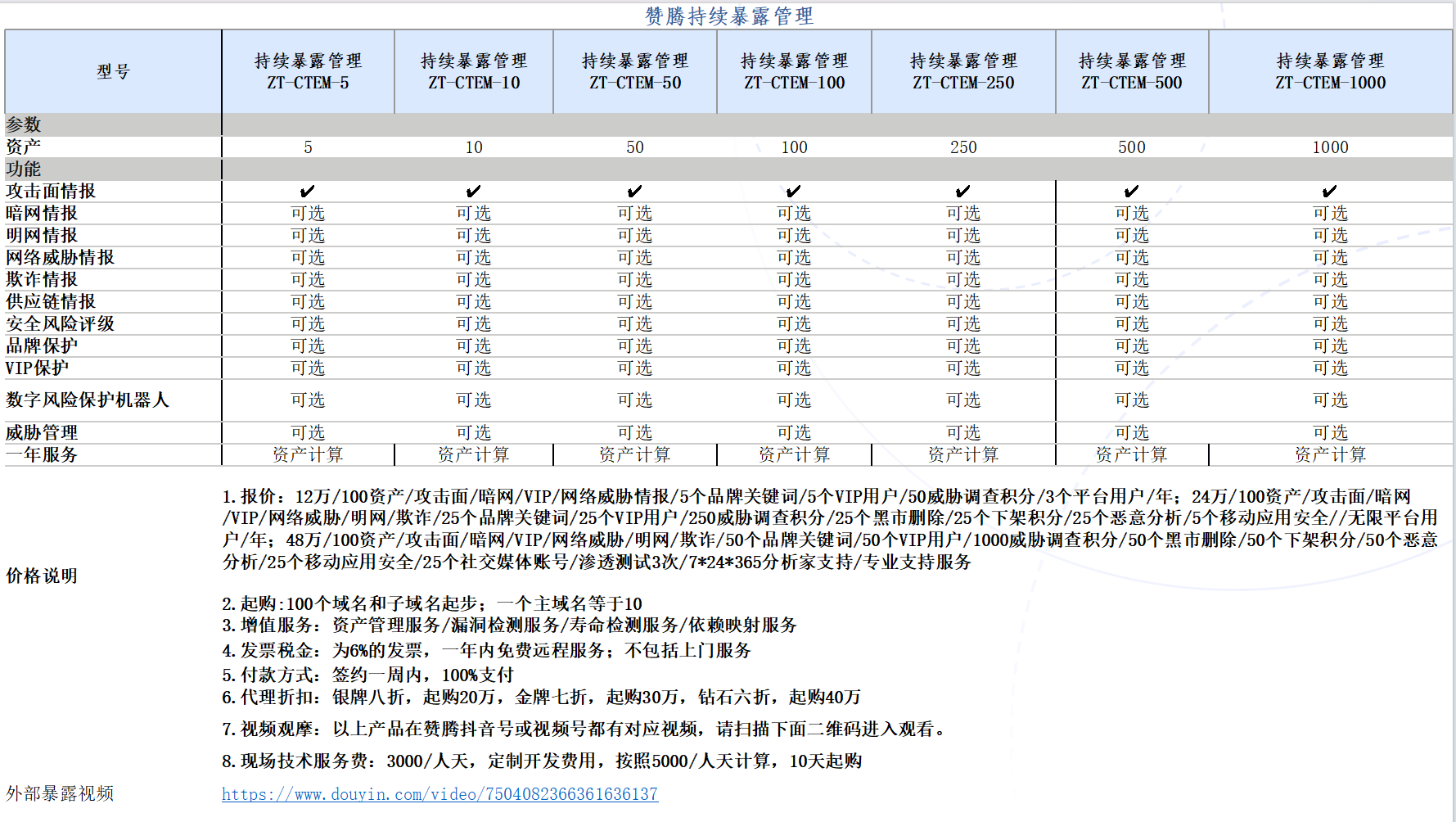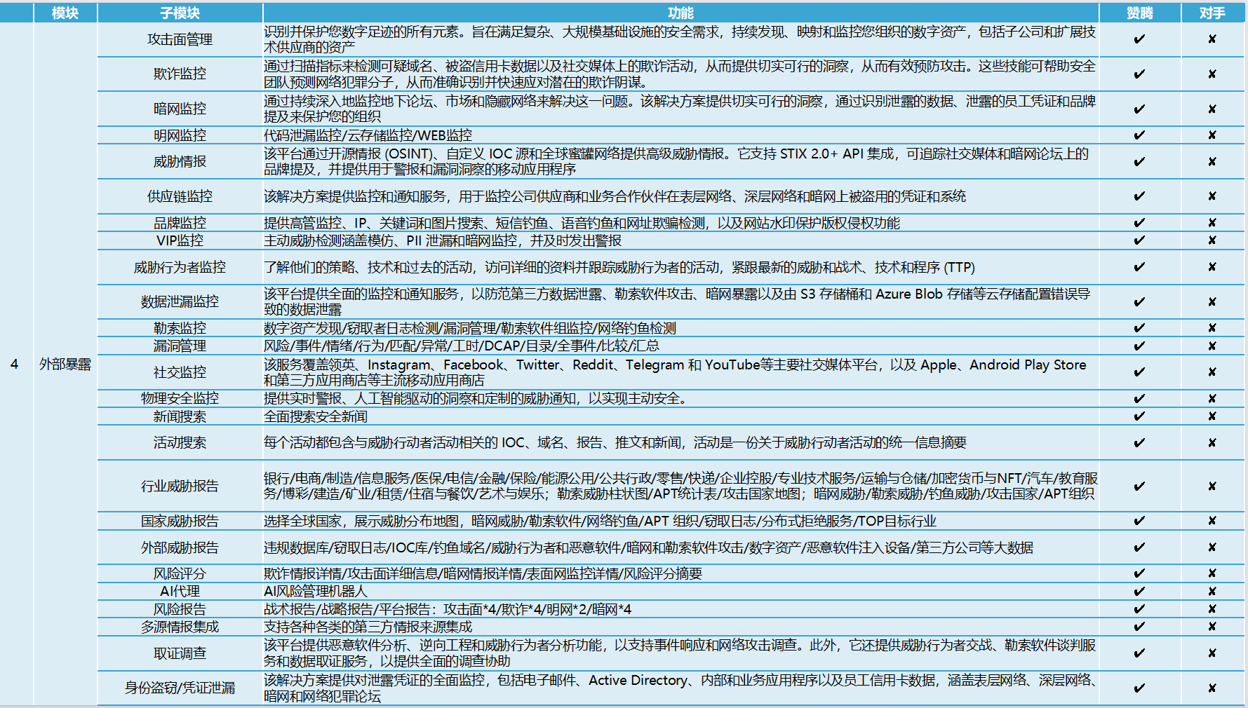 外部暴露包括攻击面情报、VIP情报、品牌保护、供应链情报、网络威胁情报、暗网情报、勒索情报、欺诈情报、物料安全情报、威胁管理服务等功能。